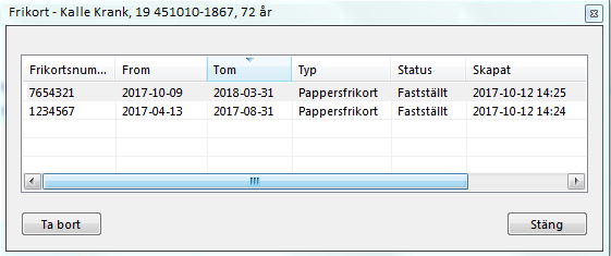 Här kan Du även ta bort ett frikort om det blivit fel. Markera raden och klicka på "Ta bort" (gäller bara manuella pappersfrikort).